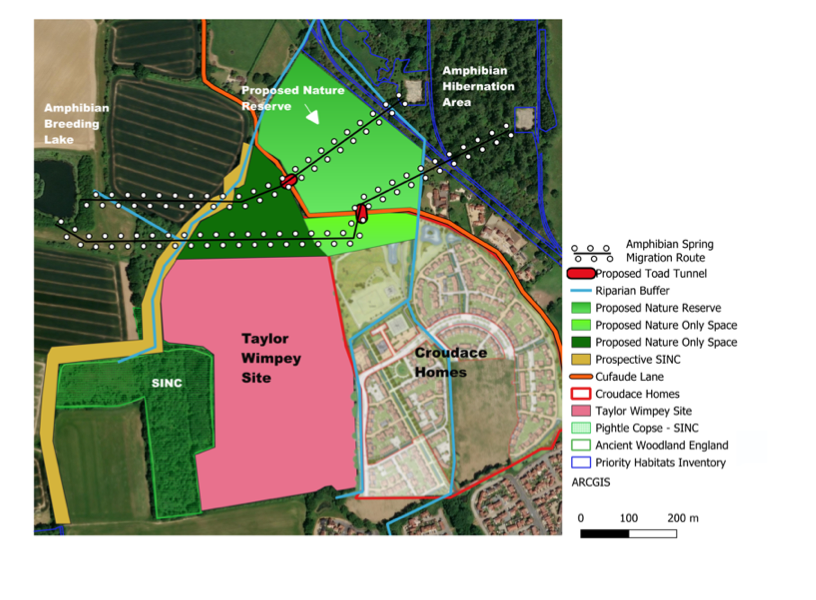 ‘Amphibian Spring Migration Route’ – indicates the general direction of migration route for Common Toads and other amphibians; migration occurs in the reverse direction in autumn. Amphibians would access the wildlife corridor via toad tunnels from the new nature reserve to the east.